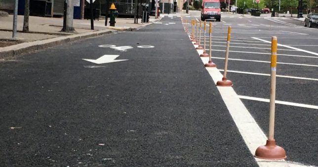 A lot of workarounds for cyclists have been developed over the years, like “sharrows” to remind drivers to be aware of two-wheeled vehicles sharing the streets. There are tricks like the “Dutch Reach,” a car door-opening approach parked drivers are encouraged to use to avoid hitting cyclists; basically, it involves using the hand furthest from the door, resulting in an overreach that forces the driver to look backward briefly. For their part, some cyclists strap things like pool noodles to the backs of their bikes, a visible reminder of how much clearance they are entitled to while riding in lanes or along shoulders. Activists have taken things further, too, installing guerrilla bike lanes with whatever is at hand, from official-looking posts and traffic cones to toilet plungers. The idea here is to spur cities into action, using temporary measures to encourage permanent changes.
